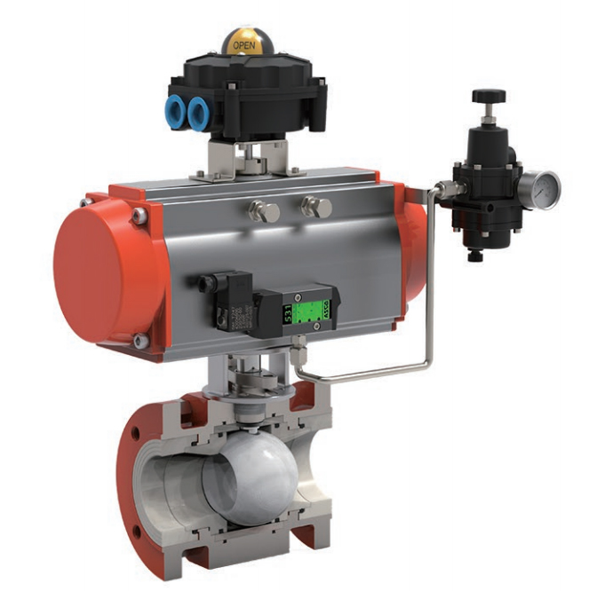 气动耐磨陶瓷球阀V型球阀阀芯设计成带有特殊开关的V型缺口,流通能力大,压力损失小,并具有精确的截流特性和控制功能,流量特性为近似等百分比。启闭件采用V型球缺结构,完全解决了阀腔易沉积介质的