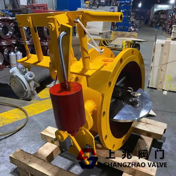 DMF-0.5 电磁式煤气安全阀为法兰连接,杠杆式启闭阀,它主要由电磁铁,杠杆装置弹簧及重锤,阀体,阀板和轴等零件组成,当煤气或助燃气空气压力处于正常状态时,安全阀处于全开位置,当煤气或助燃空气低压时,通过相应的电路设计,可使用电磁铁在某一规定的低压时失电,这样杠杆失去平衡,安全阀相连接的杠杆脱扣,重锤落下,安全阀立即关闭。另外供电系统一点断电,也即电磁铁失电和上述过程相同,安全阀立即关闭,这样就达到了煤气或助燃空气低压时以及断电时,快速断电时切断煤气的目的。